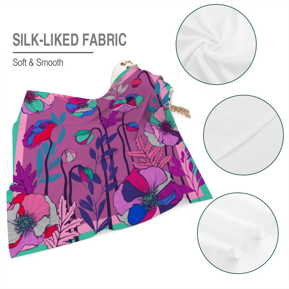 Cool Poppies reimagines the poppy motif in deep violet, cool greens and blues with a pop of pink . The cooler palette is modern on the glossy poly-satin surface, with thermal transfer printing holding the cool hues true. Use it to add a crisp accent to grey, navy or cool neutral outfits — worn as a tidy neck scarf or a soft shoulder wrap.