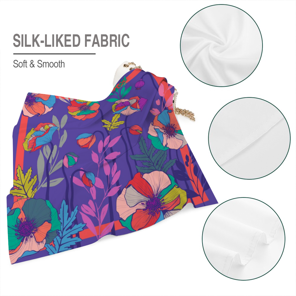 Fresh Poppies — a lively, modern take on the classic poppy in blended brights and mid-tones. This 36" square balances clarity with approachability, delivering a pop of color that’s playful yet polished. The supreme poly-satin finish gives luminous shine and thermal transfer printing preserves crisp pattern detail. Tie it on a low bun, knot it to your bag, or fold it into a chic neck scarf for a fresh, contemporary lift.