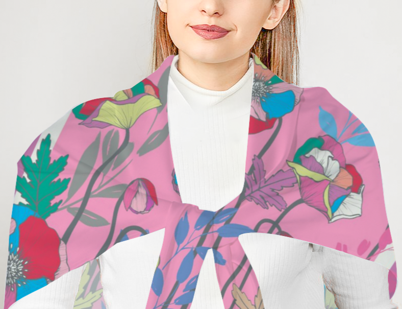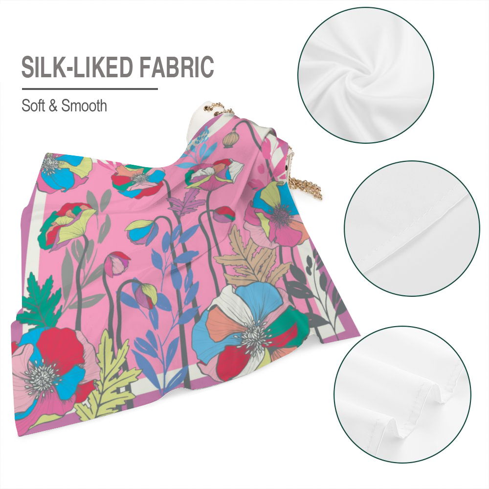 Light Poppies is airy and luminous — a delicate poppy print in pale tints and whisper-soft hues. The large 36" square gives you plenty of fabric to drape gently around the shoulders or tie as a pretty hair wrap. The glossy poly-satin finish enhances the scarf’s sheen while thermal transfer printing preserves the soft subtleties of the palette. Perfect for light, luminous wardrobes and daytime elegance.